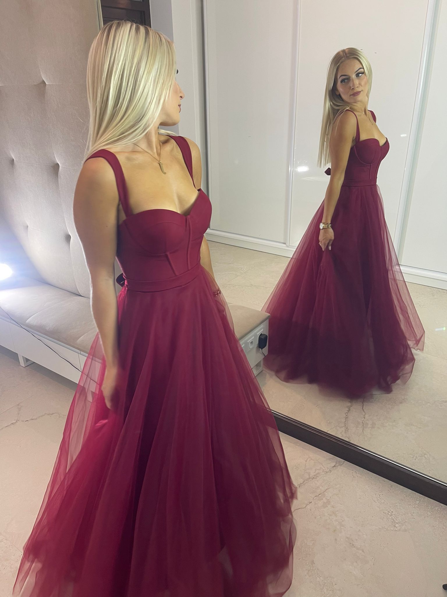 Sukienka maxi z gorsetową górą, dostępna w dwóch rozmiarach. Wiązanie z tyłu pozwala na idealne dopasowanie do sylwetki, a dodatkowy suwak ułatwia zakładanie. W zestawie stylowy pasek.