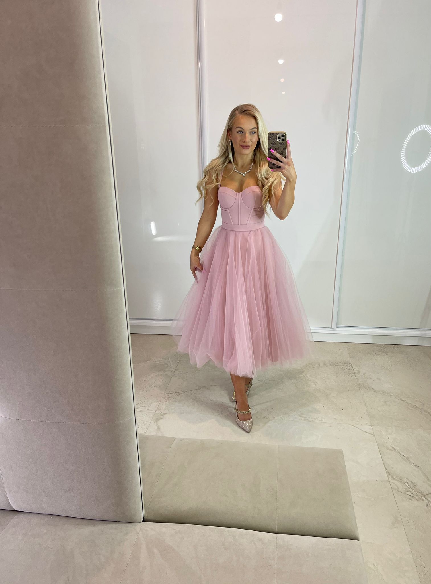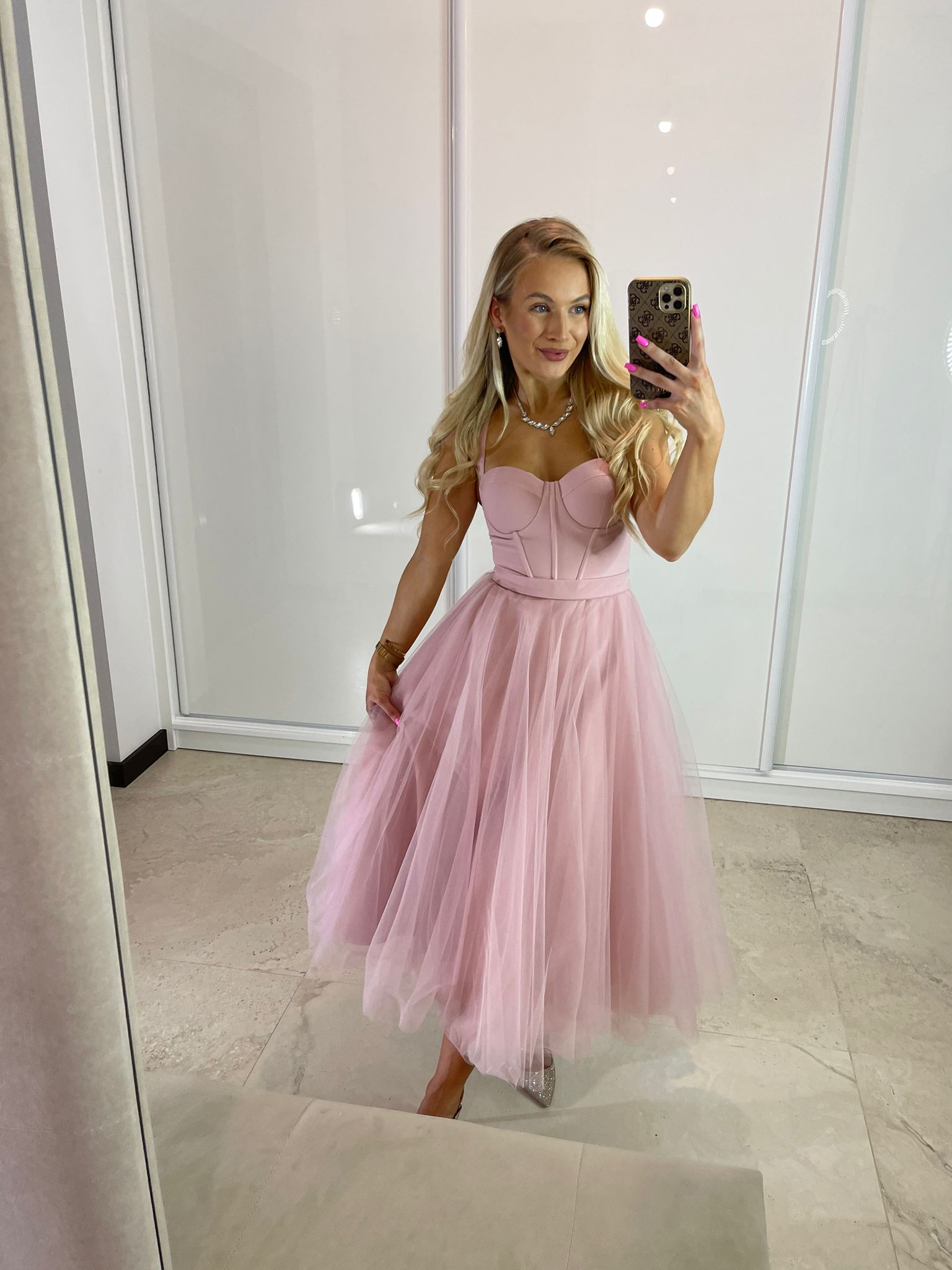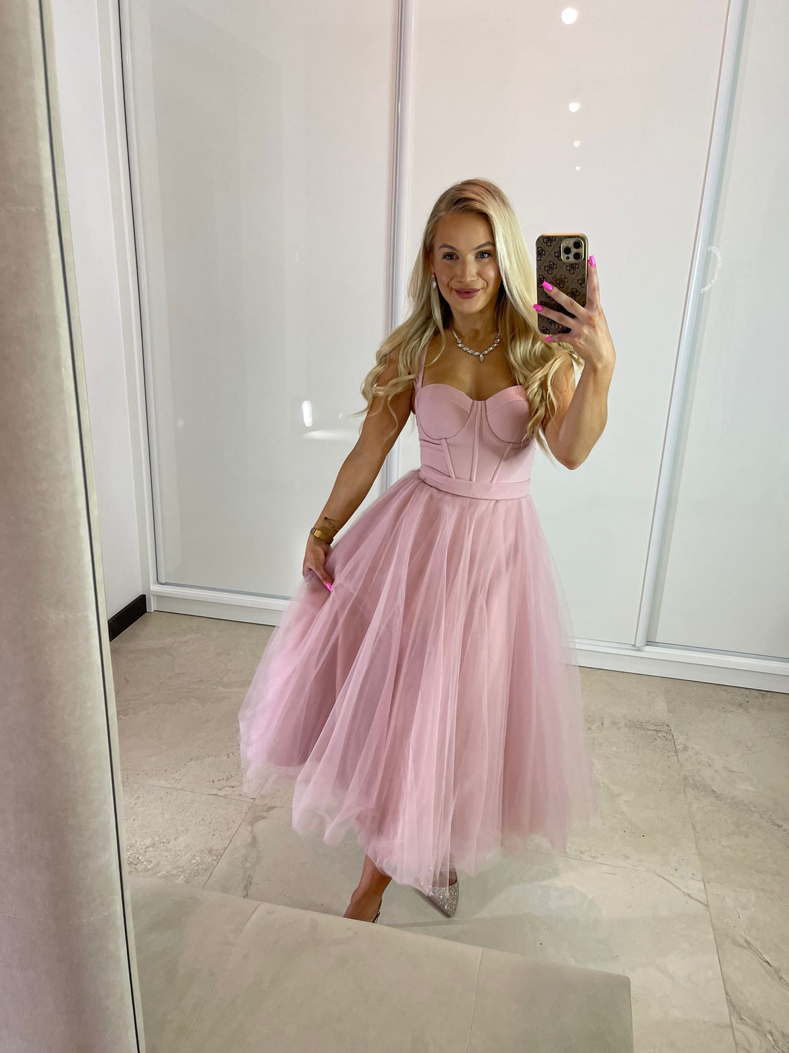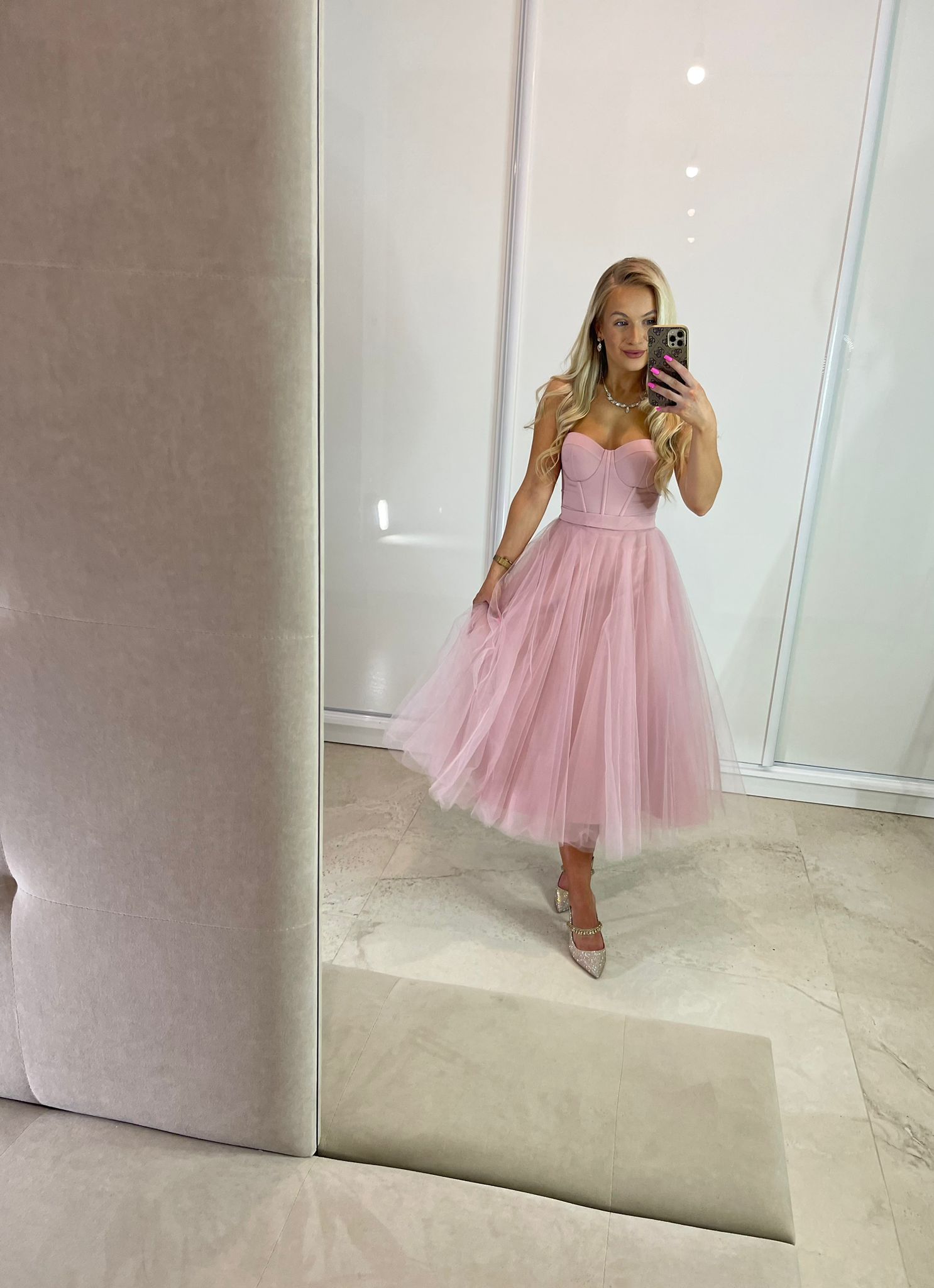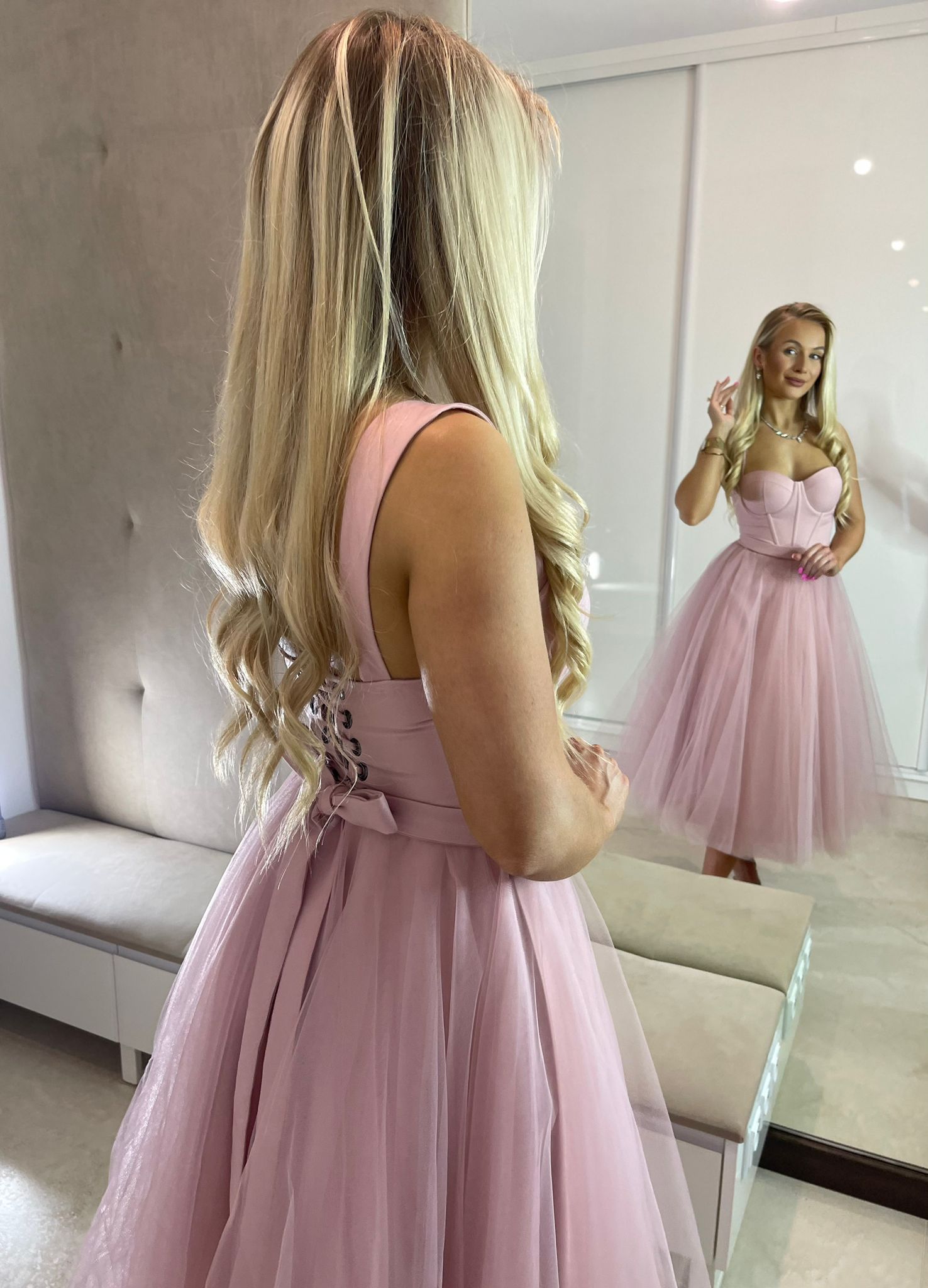 Sukienka midi z gorsetową górą, dostępna w dwóch rozmiarach. Wiązanie z tyłu pozwala na idealne dopasowanie do sylwetki, a dodatkowy suwak ułatwia zakładanie. W zestawie stylowy pasek.