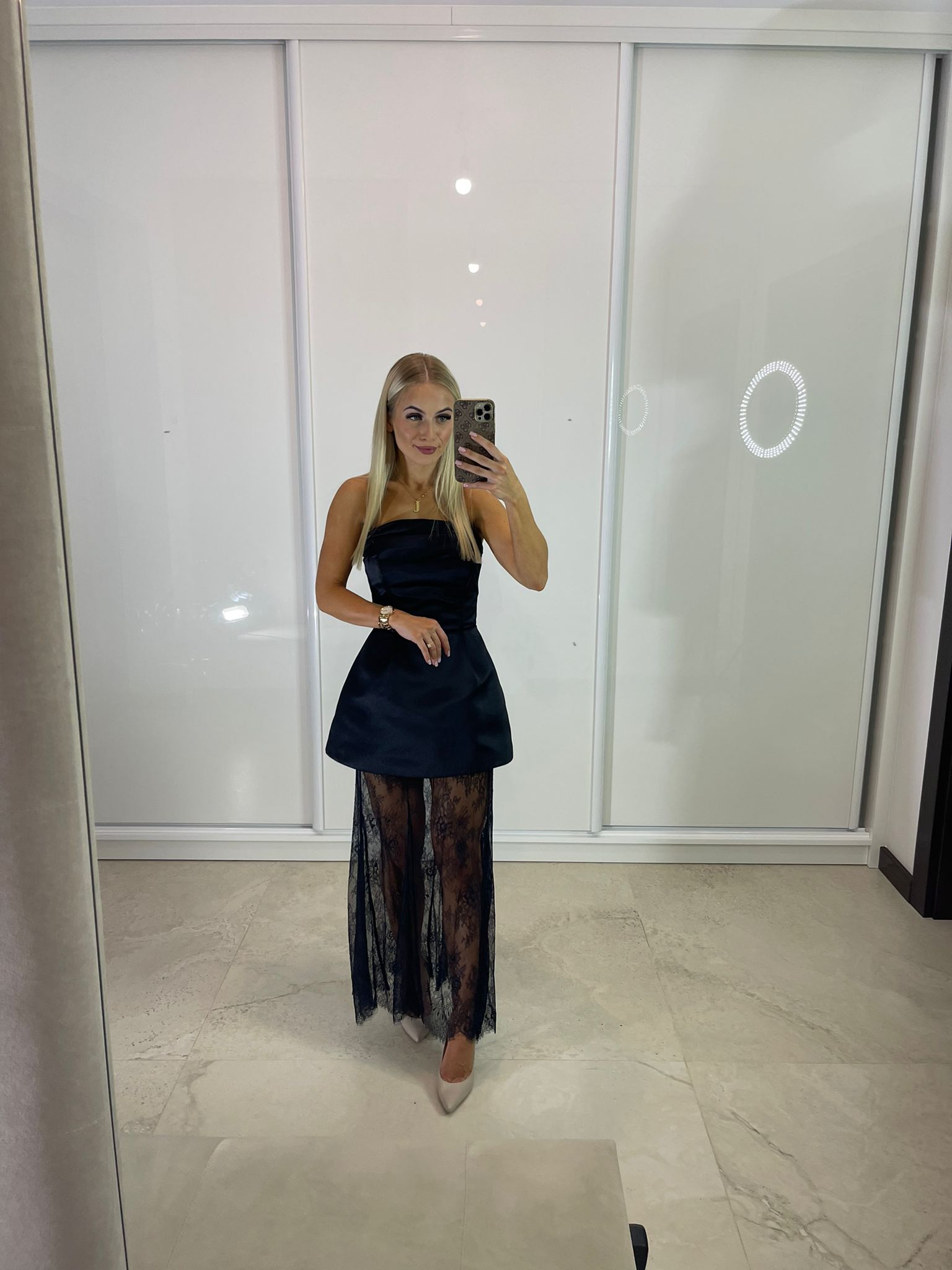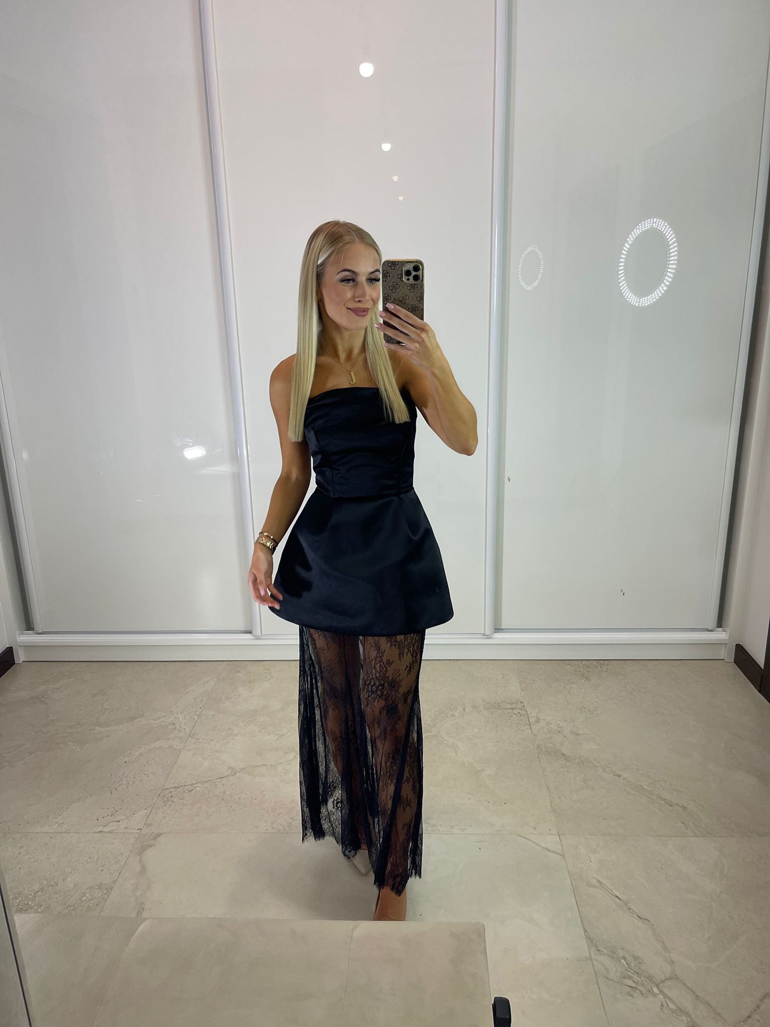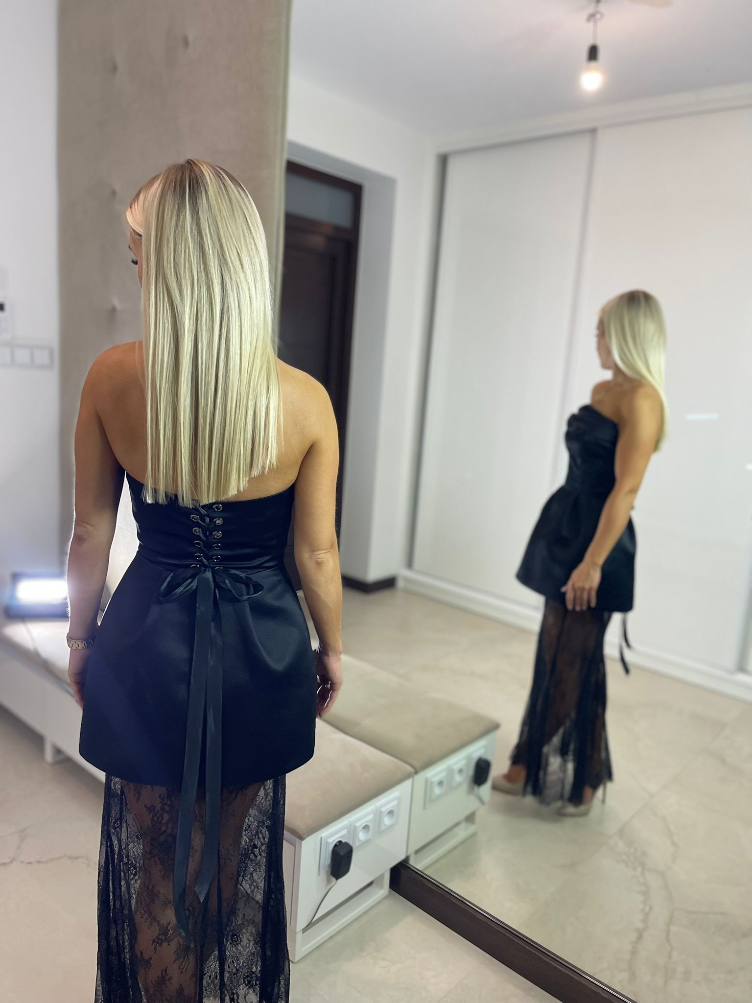 Sukienka maxi z gorsetową górą oraz dodatkową spódnicą czarną koronkową – dostępna w dwóch rozmiarach. Wiązanie z tyłu pozwala na idealne dopasowanie do sylwetki, a dodatkowy suwak ułatwia zakładanie.