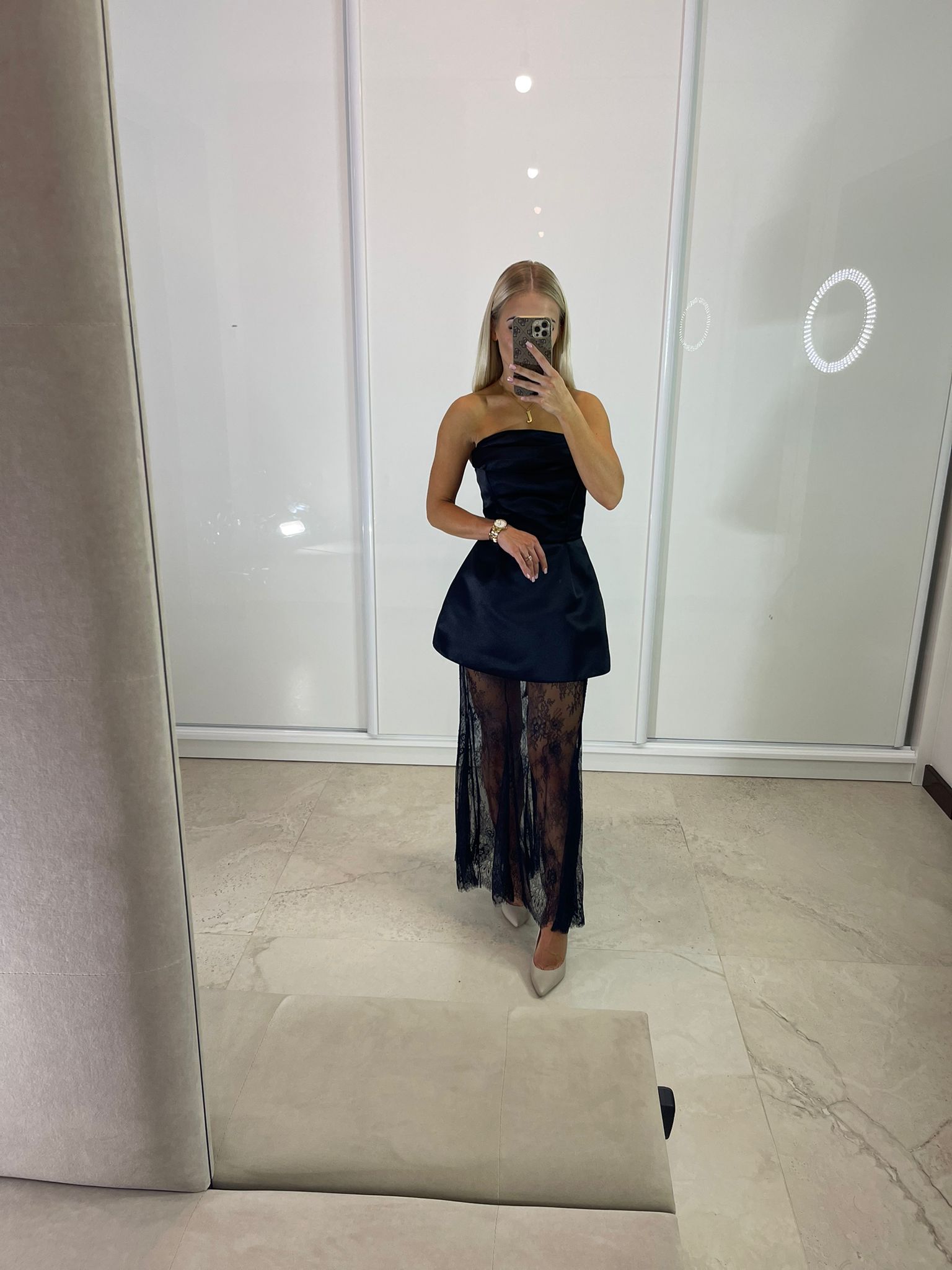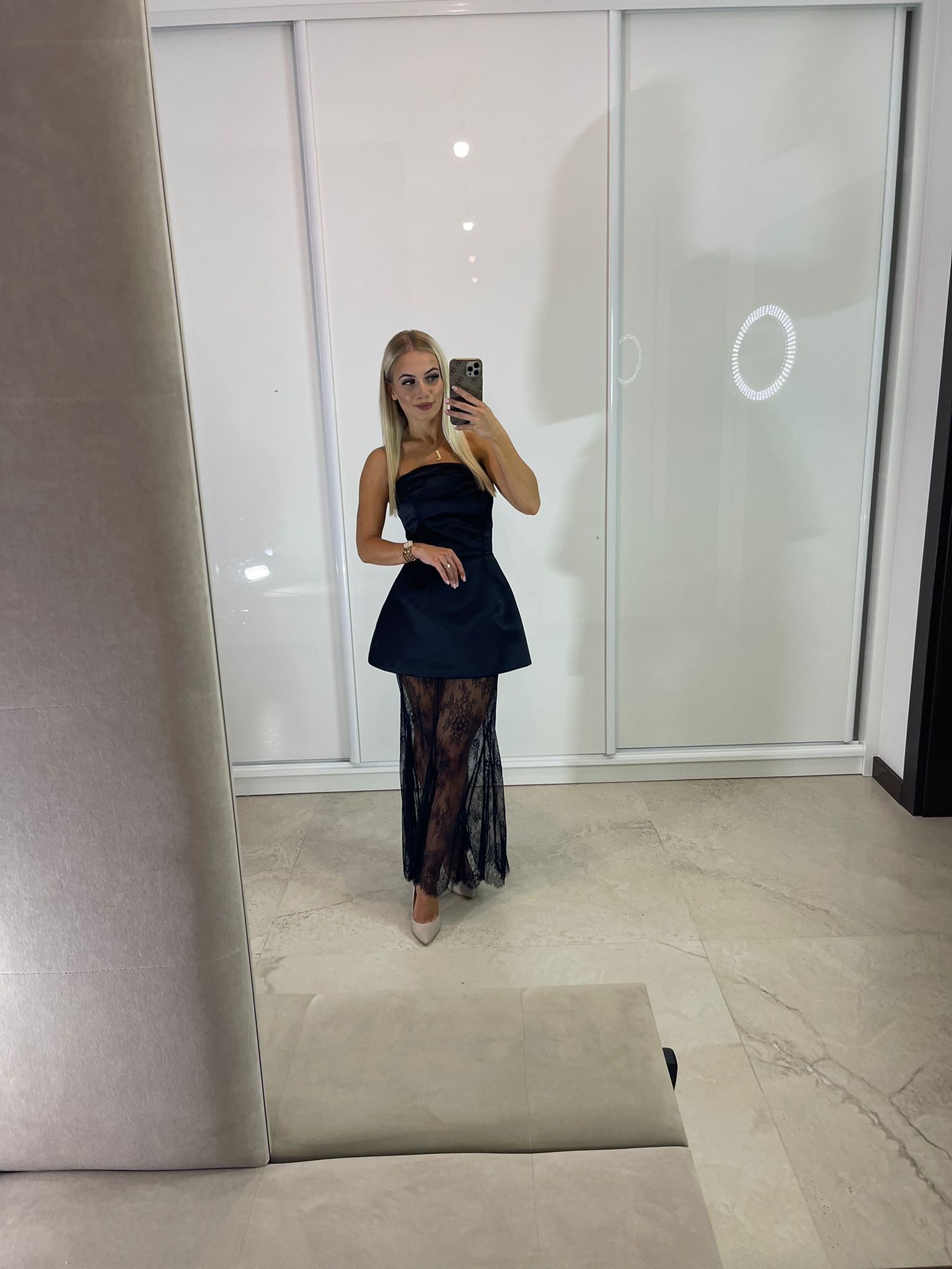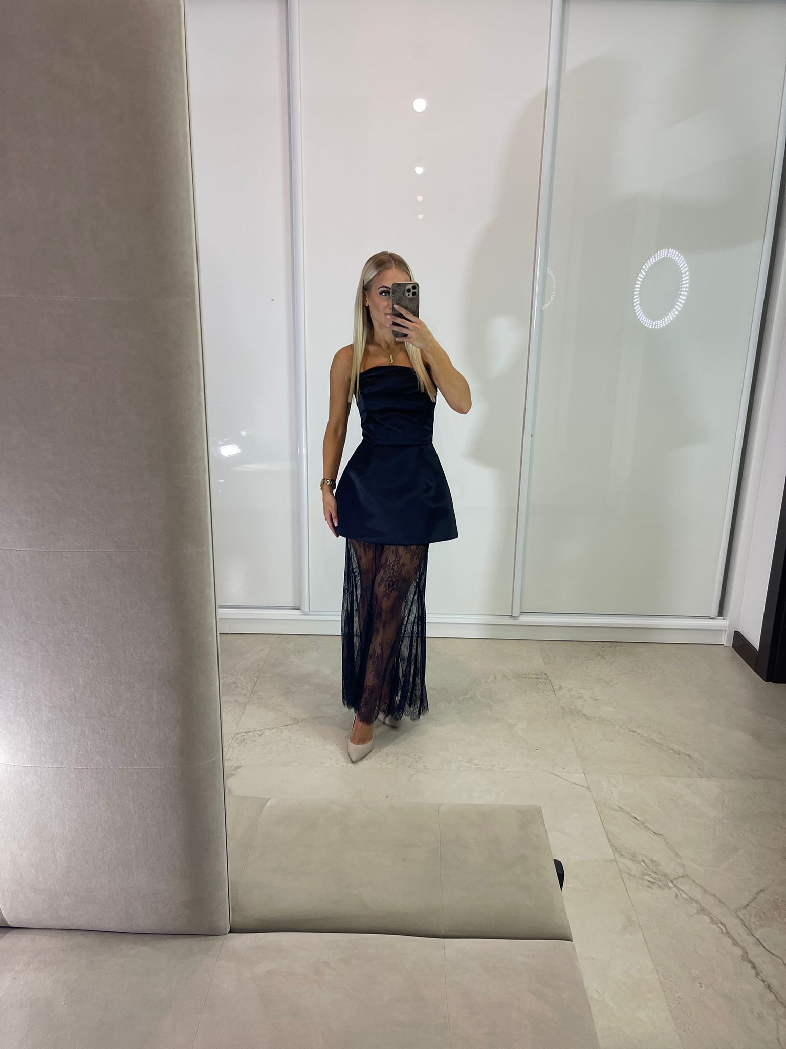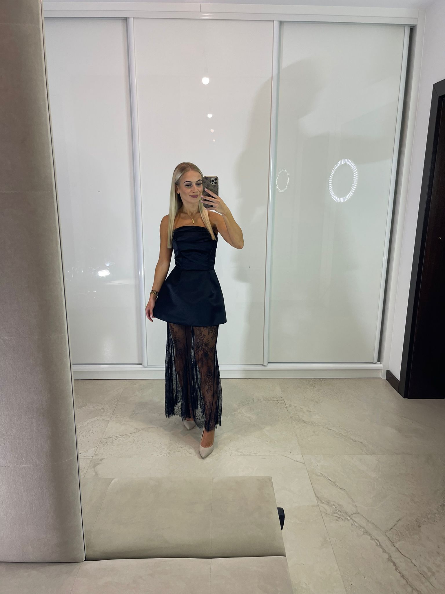 Sukienka maxi z gorsetową górą oraz dodatkową spódnicą czarną koronkową – dostępna w dwóch rozmiarach. Wiązanie z tyłu pozwala na idealne dopasowanie do sylwetki, a dodatkowy suwak ułatwia zakładanie.