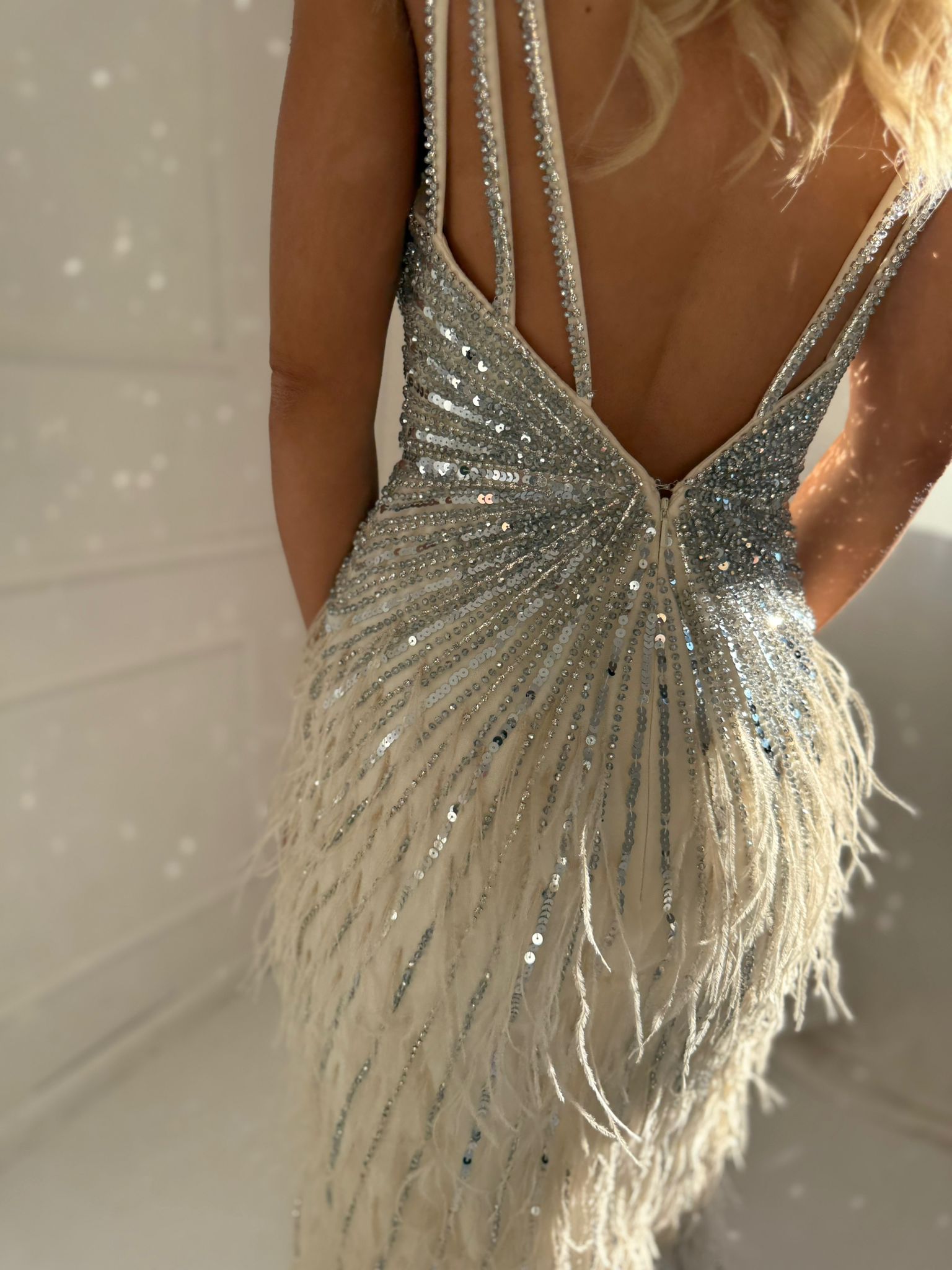 Elegancki model o dopasowanym kroju, bogato zdobiona kryształami i koralikami, które subtelnie połyskują przy każdym ruchu. Głęboki dekolt w kształcie serca oraz delikatne, tiulowe pelerynowe rękawy nadają jej lekkości i luksusowego charakteru. Idealna na wyjątkowe, wieczorowe okazje.